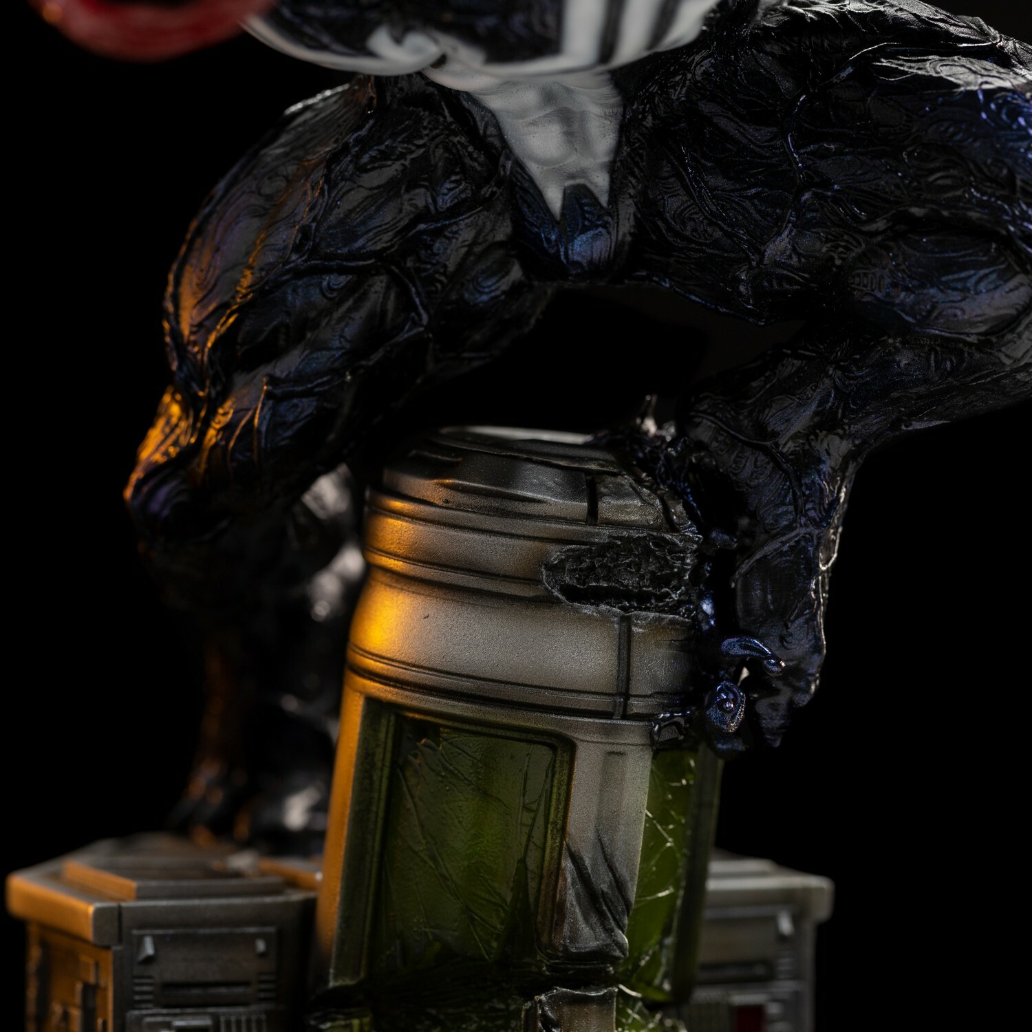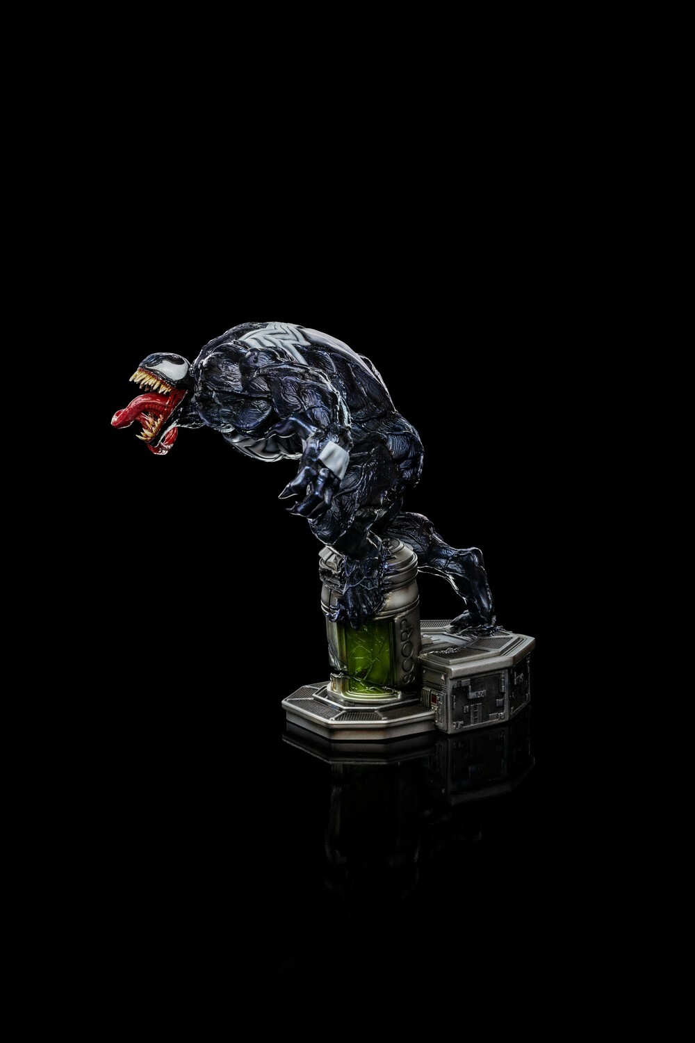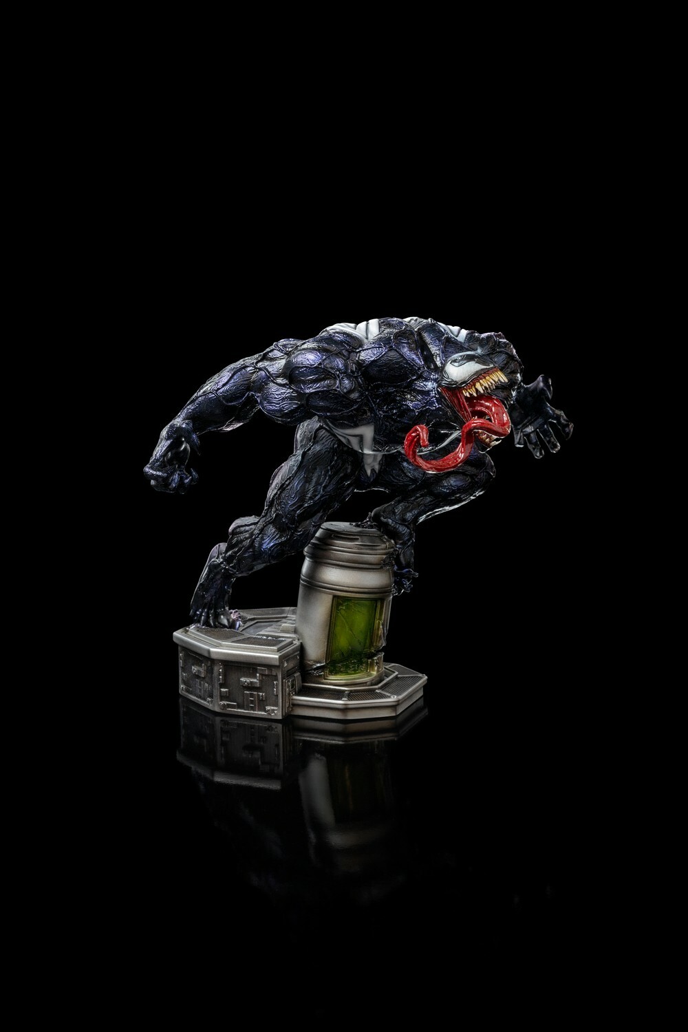 Iron Studios apportera également la version Deluxe « Venom Deluxe – Spider-Man vs Villains – Art Scale 1/10 », avec une base avec des vrilles de la biomasse extraterrestre de goudron apparaissant comme si elles sortaient d’une prison sous la forme d’un structure cylindrique avec des vitraux verts à ses pieds, à côté de tentacules qui reproduisent sa bouche et ses dents aux extrémités, visant à capturer sa proie.