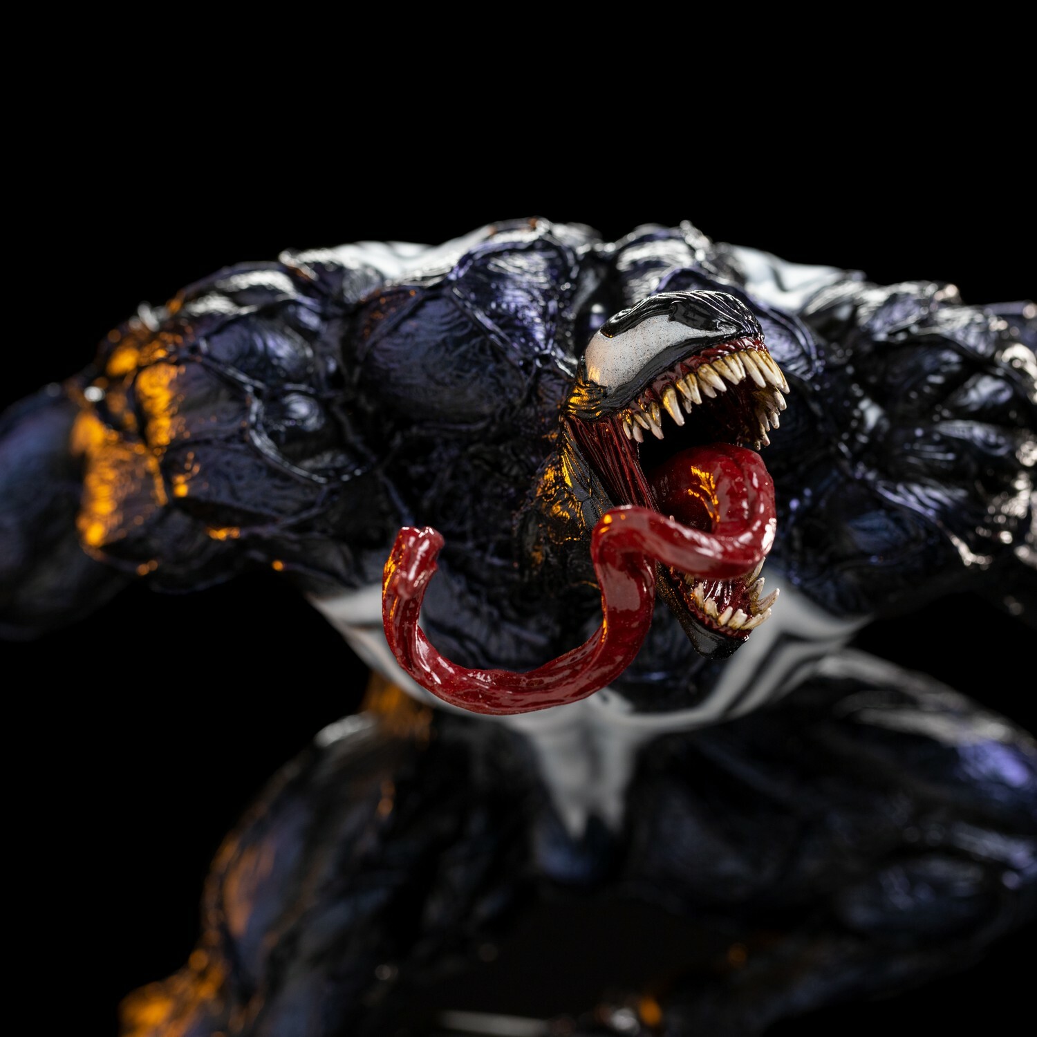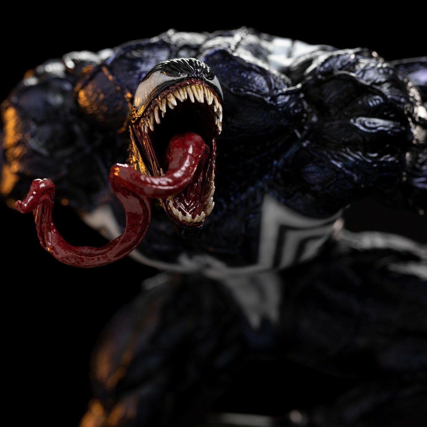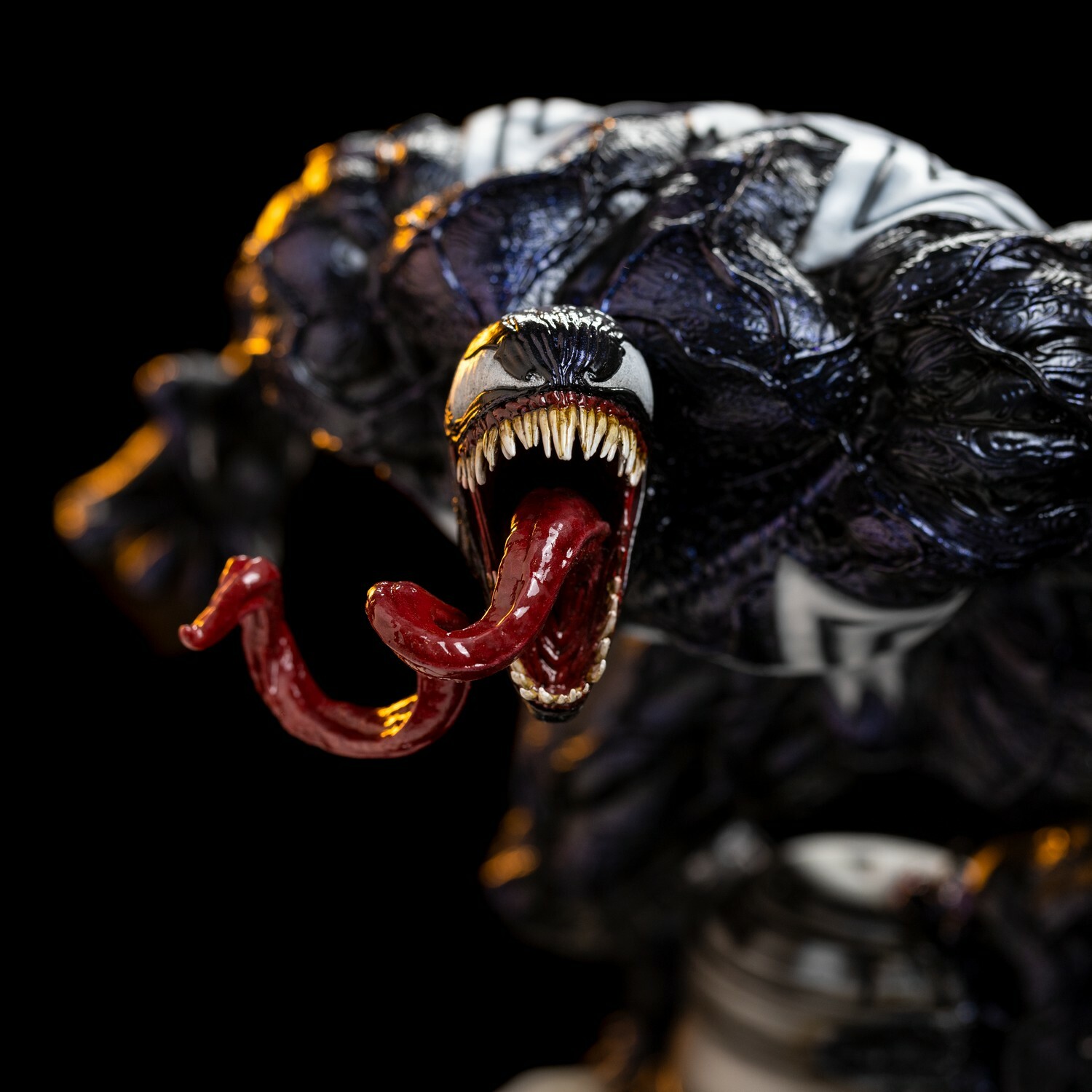 Iron Studios apportera également la version Deluxe « Venom Deluxe – Spider-Man vs Villains – Art Scale 1/10 », avec une base avec des vrilles de la biomasse extraterrestre de goudron apparaissant comme si elles sortaient d’une prison sous la forme d’un structure cylindrique avec des vitraux verts à ses pieds, à côté de tentacules qui reproduisent sa bouche et ses dents aux extrémités, visant à capturer sa proie.