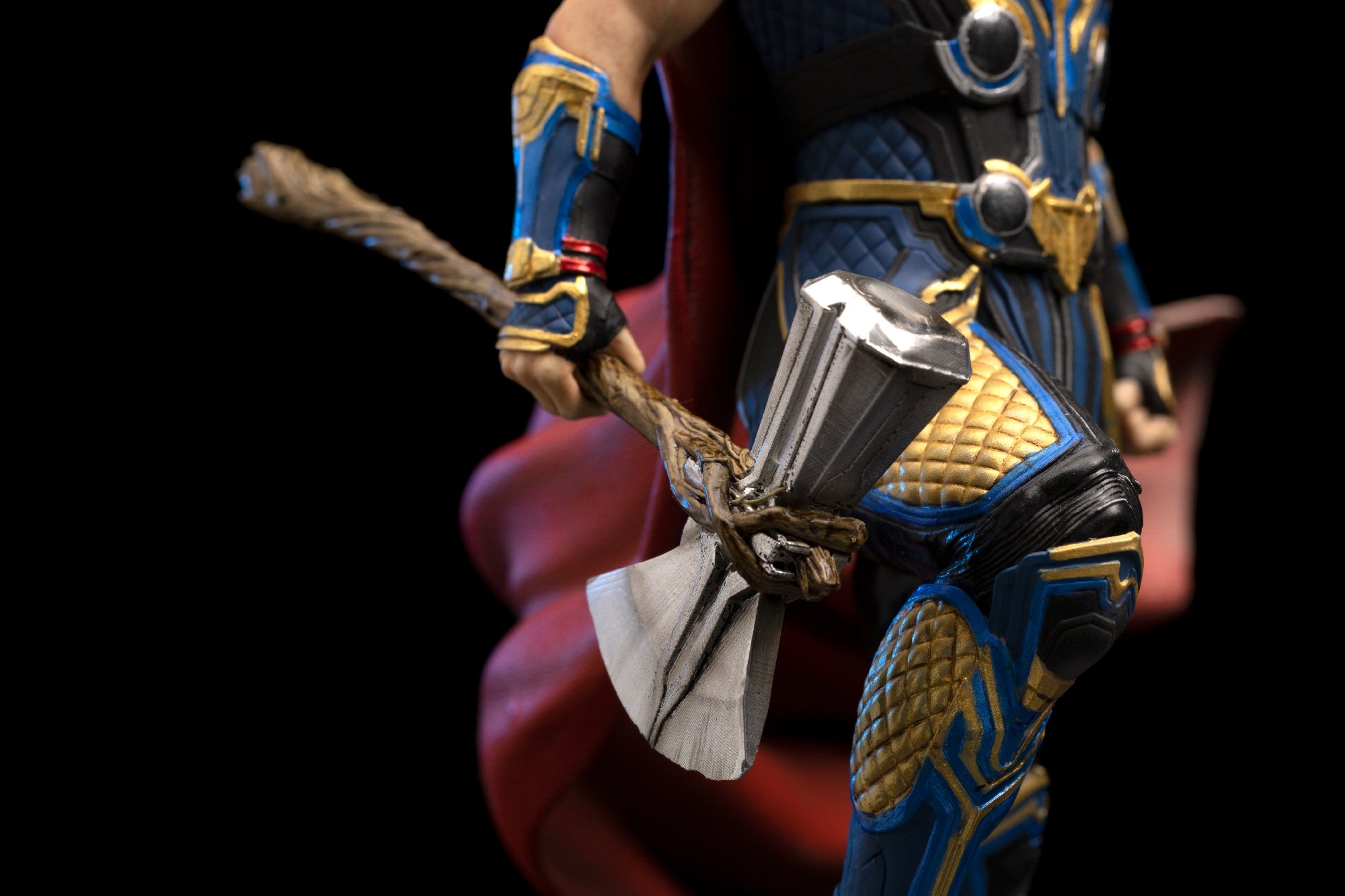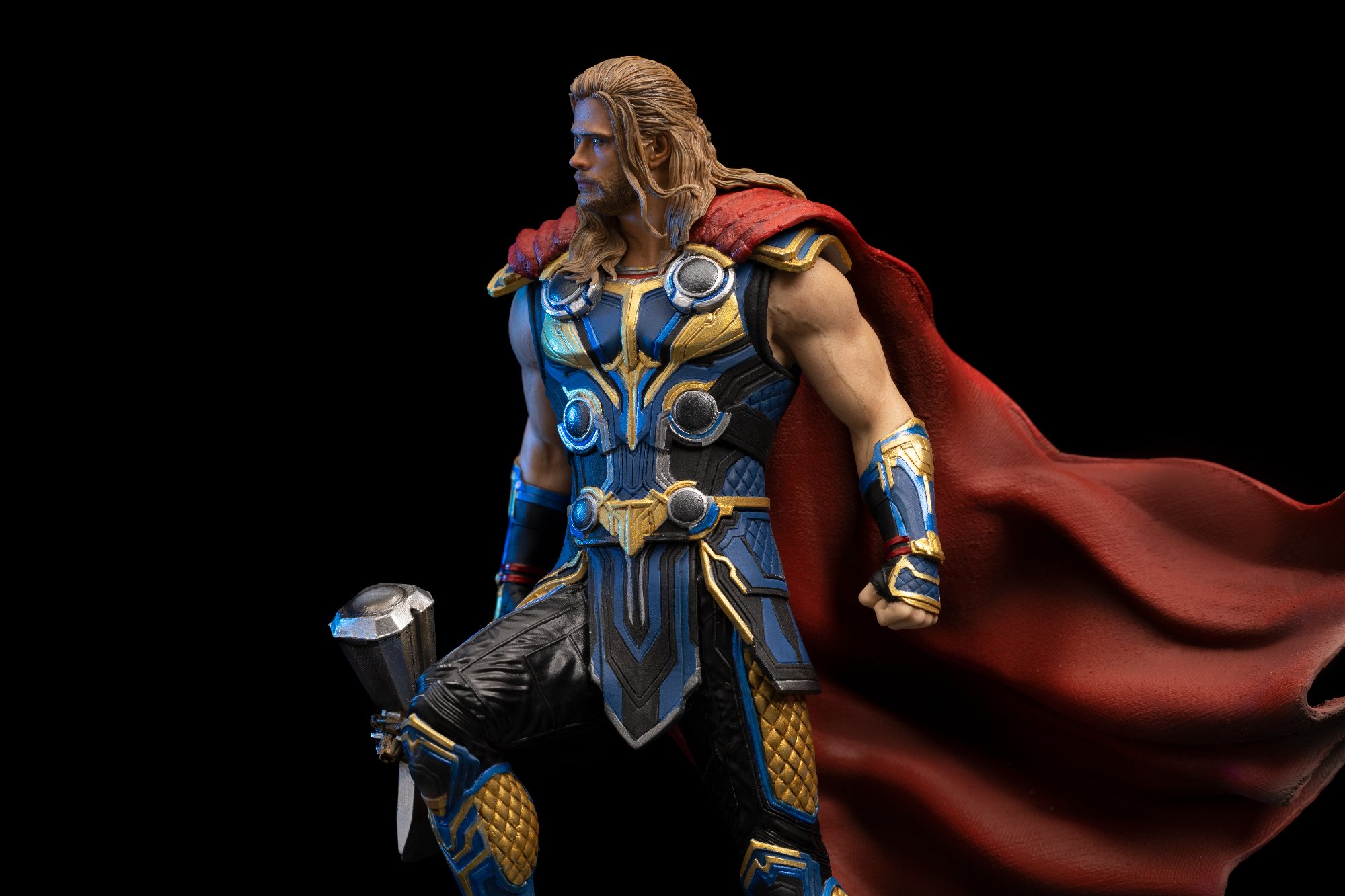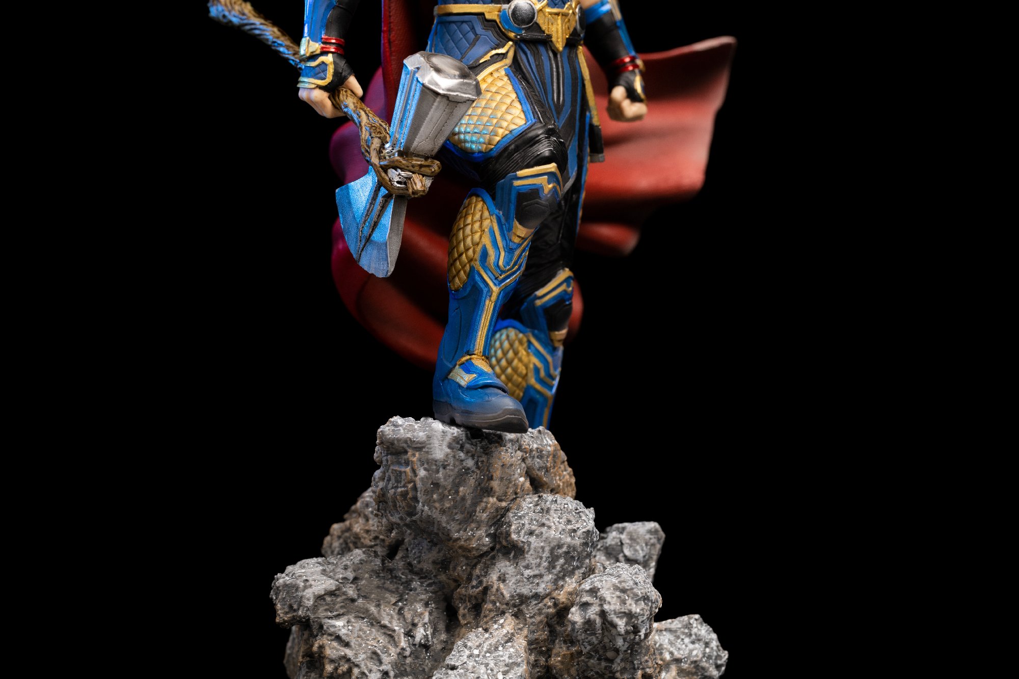 Sur un piédestal de montagne rocheuse, brandissant la hache puissante et enchantée Stormbreaker, le fils d’Odin apparaît portant sa nouvelle armure asgardienne dans des tons de bleu, noir et or. Une longue cape rouge ondulant sur le dos, il se prépare à affronter une horde de créatures de l’ombre invoquées par le redoutable God Butcher. Inspiré du quatrième film ‘Thor : Love and Thunder’, Iron Studios présente la statue ‘Thor BDS – Thor : Love and Thunder – Art Scale 1:10’, avec le dieu du tonnerre joué une fois de plus par Chris Hemsworth, composant le parfait à associer avec la statue ‘Mighty Thor Jane Foster BDS – Thor: Love and Thunder – Art Scale 1:10’ par Iron Studios.