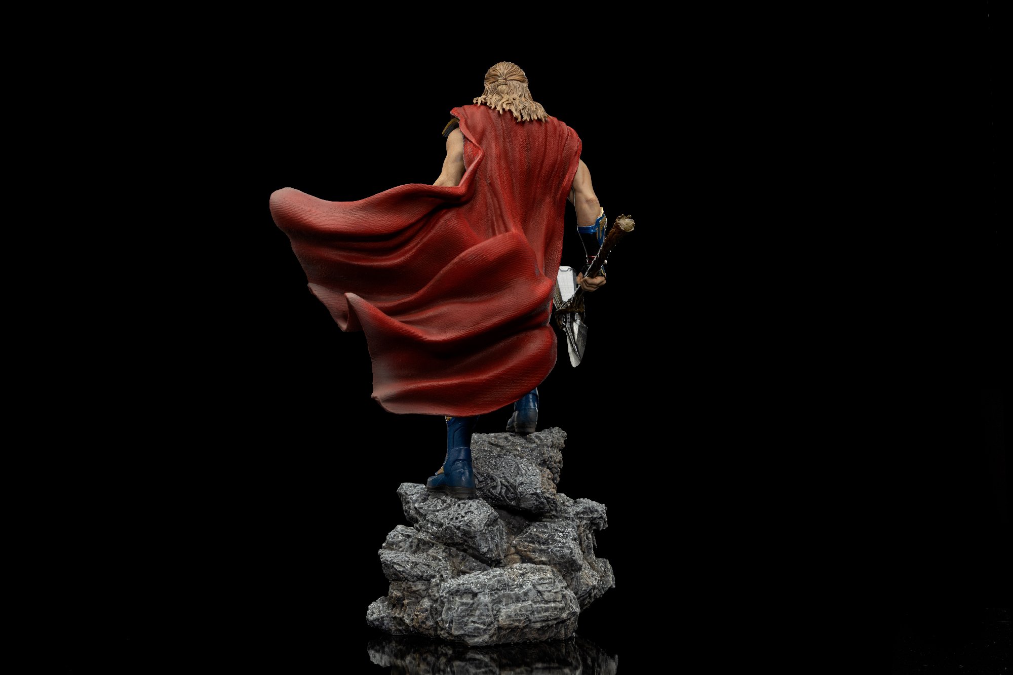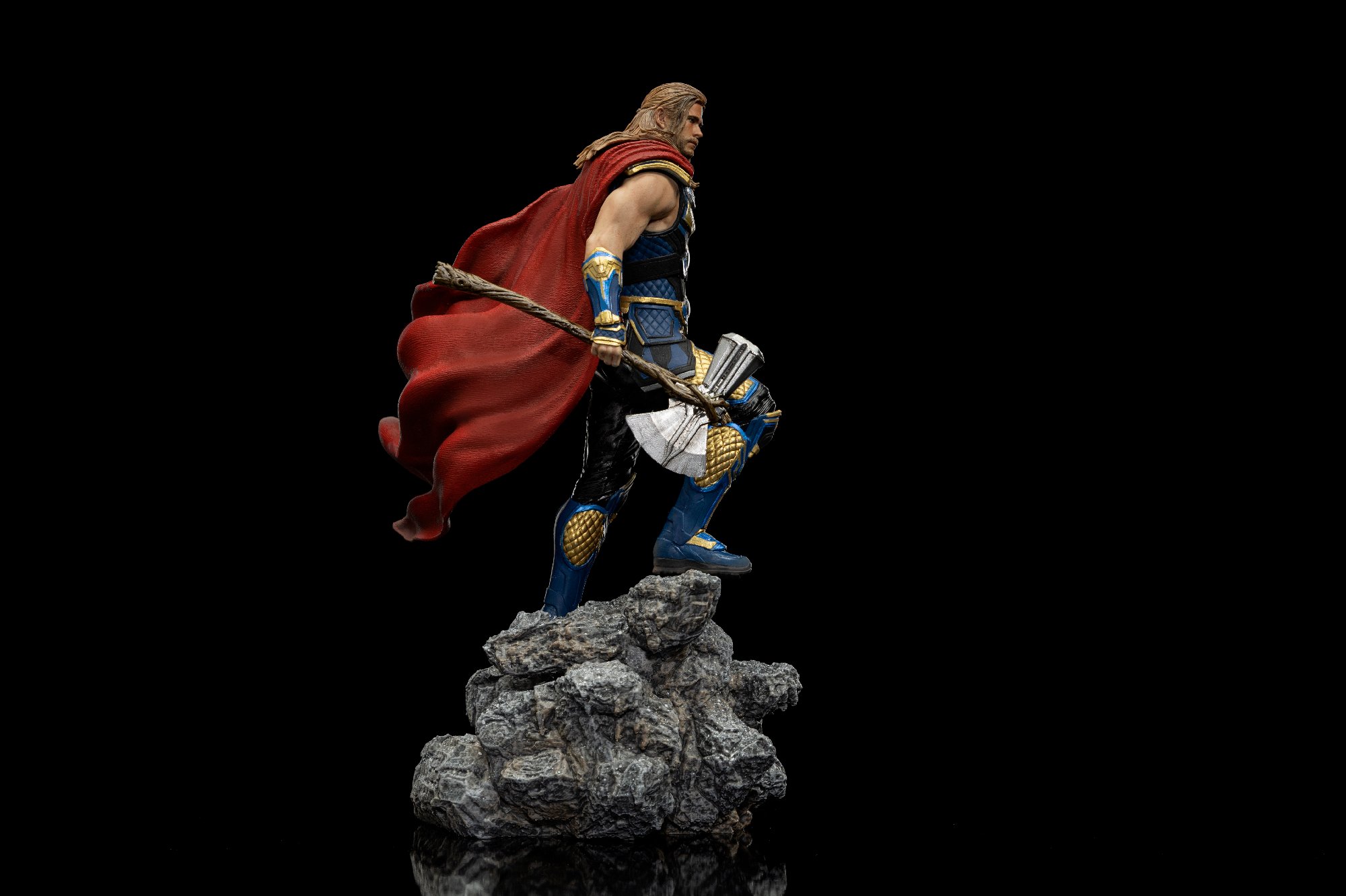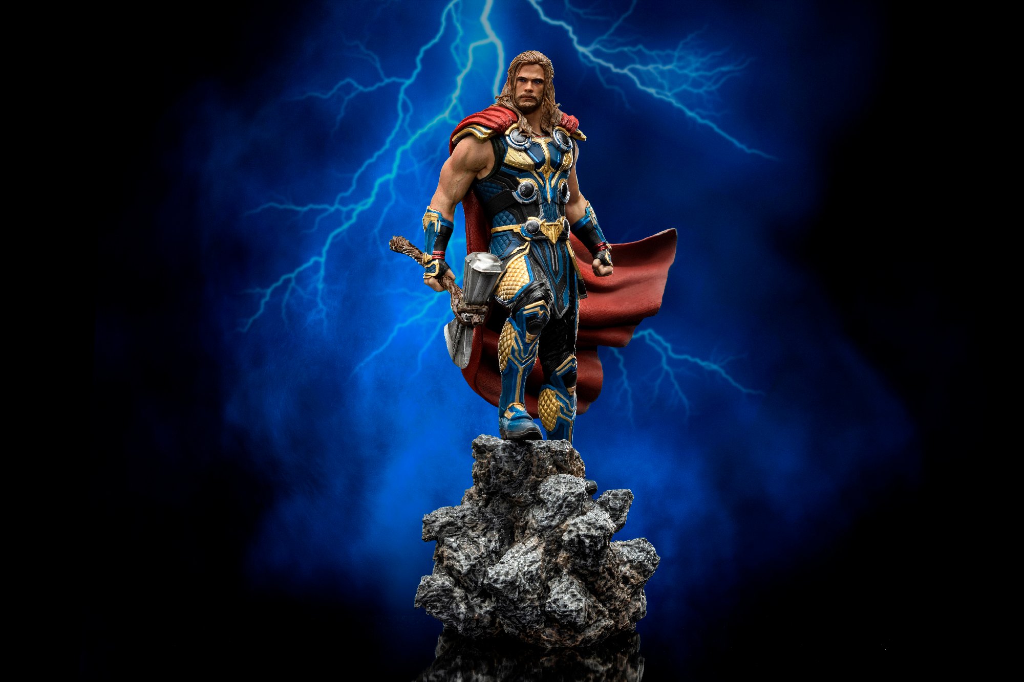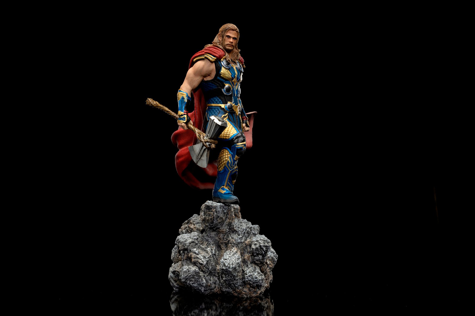 Sur un piédestal de montagne rocheuse, brandissant la hache puissante et enchantée Stormbreaker, le fils d’Odin apparaît portant sa nouvelle armure asgardienne dans des tons de bleu, noir et or. Une longue cape rouge ondulant sur le dos, il se prépare à affronter une horde de créatures de l’ombre invoquées par le redoutable God Butcher. Inspiré du quatrième film ‘Thor : Love and Thunder’, Iron Studios présente la statue ‘Thor BDS – Thor : Love and Thunder – Art Scale 1:10’, avec le dieu du tonnerre joué une fois de plus par Chris Hemsworth, composant le parfait à associer avec la statue ‘Mighty Thor Jane Foster BDS – Thor: Love and Thunder – Art Scale 1:10’ par Iron Studios.