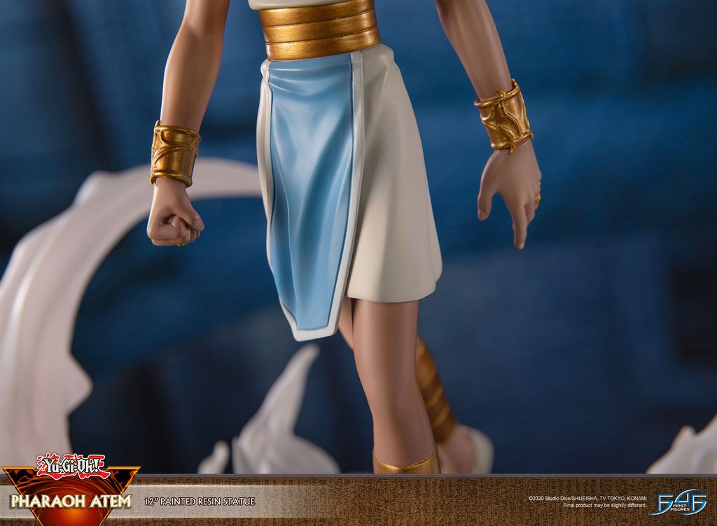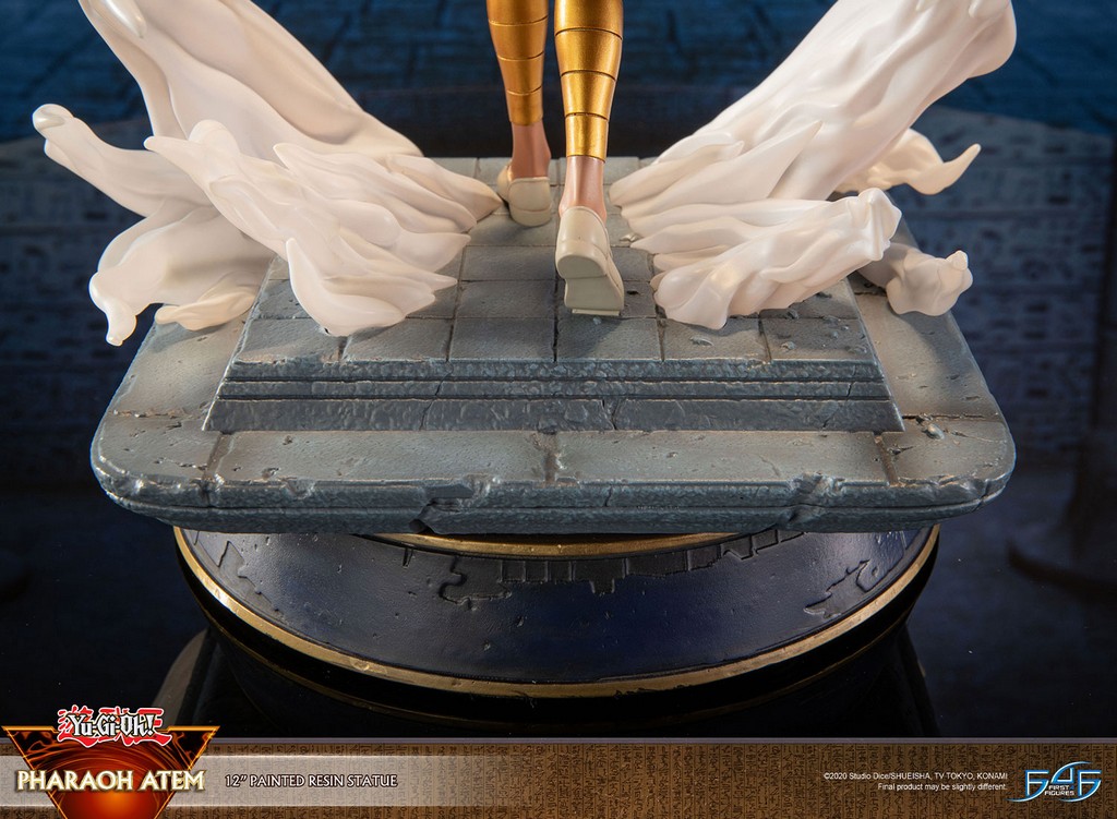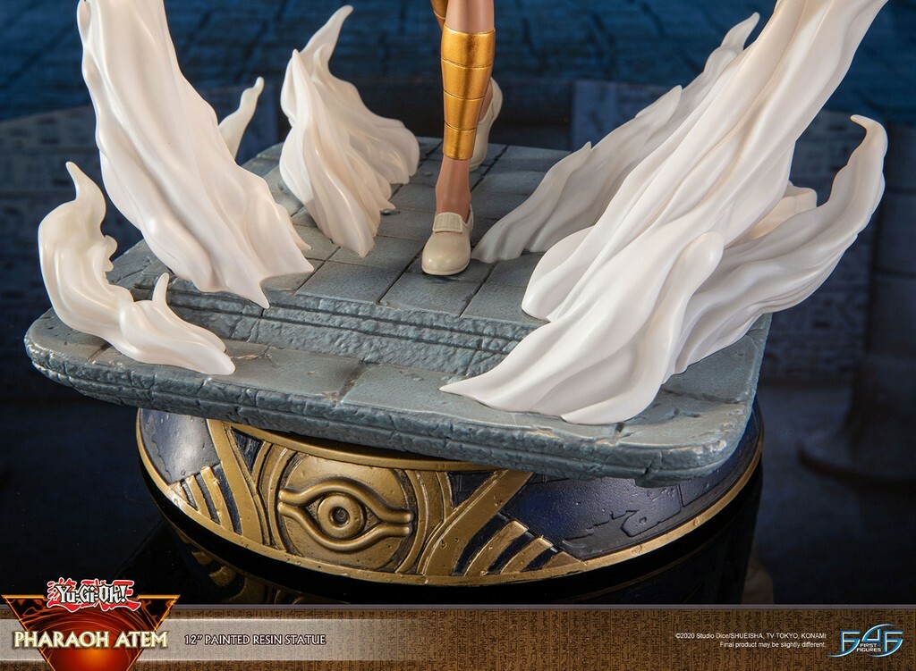Le concept de la statue est inspiré de la scène de Yu-Gi-Oh ! quand Atem franchit la porte de l’au-delà après avoir été libéré par Yugi Muto. La statue capture méticuleusement les détails d’Atem, de ses cheveux tricolores emblématiques couronnés par la coiffe Millennium Puzzle à son costume égyptien antique. Atem est représenté dans une pose en train de marcher, sa cape fluide ajoutant un mouvement dynamique au design, tandis que la fumée tourbillonnante autour de la base ajoute une touche dramatique à la scène. La base est ornée de l’Œil doré d’Anubis sur fond bleu.